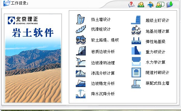 岩土工程分析软件 岩土能够分析计算岩土工程的内力、变形、稳定性;功能齐全、操作简单、多行业标准、图文并茂的计算书。涵盖岩土工程设计、治理等各个领域,在三峡工程、青藏铁路、广州地铁等重大工程中成功应用;适应铁路、公路、水利、电力、市政、城建等行业应用;特别适合相应的地质灾害治理。 【基坑支护】深基坑支护结构设计软件 《规程》设计已经比传统手算节省20%左右;具有一定经验的工程师还可调整水、土压力及内力计算结果,设置支点预应力及利用工程桩、超前花管,选择合适的地面超载形式及配筋形式等,都能进一步降低材耗,利用空间 【基坑支护】超级土钉支护设计软件 《超级土钉支护设计软件》由北京软件设计研究院开发完成,这套软件汇集了当今土钉支护设计的最新技术成果,包含5种国内相关技术规范及其它两套实用方法,涵盖了土钉支护设计理论,计算模型及方法。 【基坑支护】降水沉降分析软件 地下水位的控制对改善施工条件,保证基坑工程及邻近建筑物的安全至关重要,但任意位置水位降深及地表沉降和相邻建筑物的附加不均匀沉降,是长期困扰着工程界的两大难题。《降水分析软件》的突破恰恰就是。 【边坡治理】边坡稳定分析系统 边坡稳定分析系统最初是针对铁路、公路路基设计而开发的专业设计软件,经半年多的推广应用已经得到行业内的认可,并于99年12月通过了铁道部的鉴定,证明是高效的计算机辅助设计软件。该软件同时引起其他行业。 【边坡治理】岩质边坡稳定分析软件 ★ 简单平面(二维滑动体,滑裂面为直线)稳定性分析 ★ 复杂平面(二维滑动体,滑裂面为折线,裂隙面可为斜面)稳定性分析 ★ 三维楔形体(边坡可为正悬或倒悬)稳定性分析 ★ 夹层、互层、透镜体等任意复杂。 【边坡治理|】边坡滑坍抢修设计软件 边坡滑坍抢修设计软件能完成抗滑桩、坡底反压(反压码)、上部刷方减载的自动设计和滑坡推力、抗滑桩抗滑安全系数、桩身内力、土参数反分析的计算,进行工程量与工程造价的统计。本软件具有突出的优点。 【边坡治理】挡土墙设计软件 挡土墙是铁路、公路、水利等行业经常碰到的设计难点,稍有不慎,即会酿成事故!其难主要表现在:情况复杂多变、计算内容繁多、计算过程繁锁。手工设计难以胜任,又没有成熟适用的商品化。 北京软件设计。 【边坡治理】抗滑桩(挡墙)设计软件 抗滑桩、抗滑挡墙已被广泛应用于滑坡防治工程中,但因情况多变、影响因素众多,计算十分复杂,手工设计更是令人头痛的事情。《抗滑桩(挡墙)设计软件》的出现,给工程技术人员带来极大的方便。它不仅可以在。 【软基处理】软土路基路堤堤坝设计软件 在我国沿海与内地分布着广阔的软土地区,在软土地基上修筑路堤和堤坝一直是工程设计的难点。《软土路基(堤基)设计软件》正是针对这一难点,围绕工程急需而开发的。该软件以《公路软土地基路堤设计与施工技术。 【软基处理】地基处理设计软件 我国分布着广大的软弱土地层,工程界针对软弱土地基进行处理的各种设计、计算方法已较为成熟,但一直缺乏方便实用的计算软件,《地基处理设计软件》的开发,满足了设计、施工单位的迫切需求。 【水利工程】渗流分析软件 北京软件设计研究院在多年岩土工程实用软件开发中已形成行业知名品牌,其边坡稳定、挡土墙设计、滑坡防治及软土地基处理等成熟产品更得到铁路、公路、水利、土建等行业的充分认可。这些软件针对水利行业特殊。 【水利工程】重力坝设计软件 按承载力能力极限状态、正常使用极限状态对坝体进行设计计算,同时提供按允许应力法计算。设计中考虑了自重、静水压力、杨压力、淤沙压力、浪压力、土压力、地震等作用及其作用组合。 【水利工程】工程水力学计算软件 工程水力学计算软件三个模块:倒虹吸设计模块,适用于斜管式和竖井式布置的倒虹吸管设计与计算。 渠道设计模块,适合于清水渠道、挟沙水流渠道的流量等设计计算。水闸设计模块,适用于平底闸、宽顶堰闸、WES型实。 【水利工程】隧道衬砌计算软件 水工隧洞衬砌分析软件采用衬砌的边值问题及数值解法:将衬砌结构的计算化为非线性常微分方程组的边值问题,采用初参数数值解法,并结合水工隧洞的洞型和荷载特点,以计算水工隧洞衬砌在各主动荷载及其组合作 。 【水利工程】弹性地基梁分析软件 弹性地基梁分析软件适合于水利、港工、码头、船坞、工民建、公路、铁路等部门的基础构件及构筑物的内力、位移分析计算。并给出相应的计算结果――图形结果及文字结果,同时生成图文并茂的计算书。弹性地 。